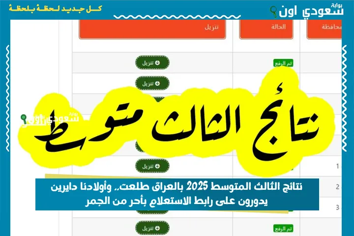 ظهرت نتائج الطلاب في الصف الثالث المتوسط في محافظات العراق، مما جعل الجميع في حالة من التساؤل المستمر عن الرابط والخطوات التي يمكن أن يتم الاستعلام من خلالها عن النتيجة ودرجات الطلاب، ويمكن أن يتم التعرف على كامل التفاصيل الخاصة بطلاب الثالث المتوسط وخطوات الاستعلام الآن عبر موقعنا سعودي أون.