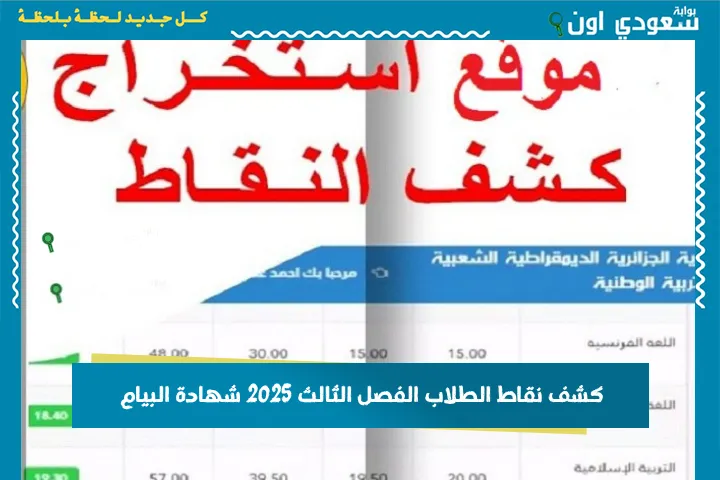 كشفت وزارة التربية الوطنية بالجزائر عن إمكانية استخراج كشف نقاط الطلاب الفصل الثالث من منصة فضاء الأولياء للعام الجاري، ولا تعتمد على تقديم هذه الخدمة فقط، ويمكن متابعة أداء التلاميذ ونتائجهم مع إمكانية التواصل مع الإدارة التعليمة بشكل مباشر، وقد ساعدن المنصة في توفير الوقت والجهد الخاص بأولياء الأمور والتلاميذ، من خلال موقع سعودي اون نتعرف على خطوات الاطلاع على كشف نقاط الفصل الثالث.