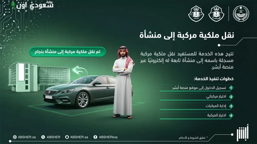 أعلنت منصة أبشر عن توفير خدمة جديدة تسمح للمستفيدين بنقل ملكية المركبات المسجلة باسمهم إلى منشآتهم بشكل إلكتروني تأتي هذه الخطوة في إطار سعي المنصة لتسهيل الإجراءات على المستخدمين، حيث يمكنهم إنجاز هذه المهمة من منازلهم دون الحاجة إلى زيارة المكاتب الحكومية.