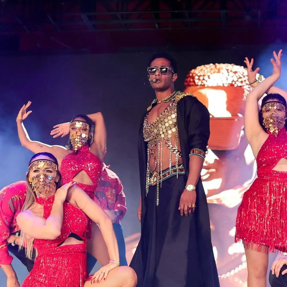 كما قام بتقديم مجموعة من أغانيه الشهيرة مثل “BUM BUM”، “نمبر وان”، و”يا حبيبي” وأثناء الحفل، قام بإعطاء الجمهور سلسلة ذهبية من ملابسه.